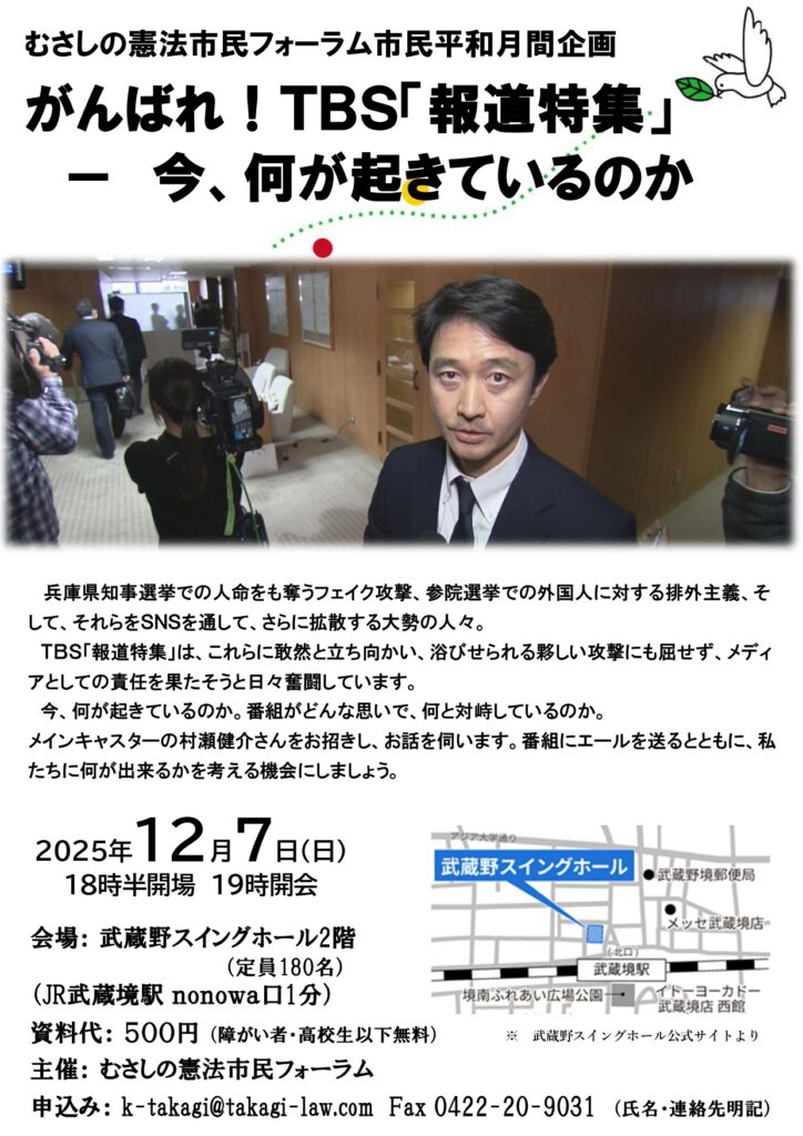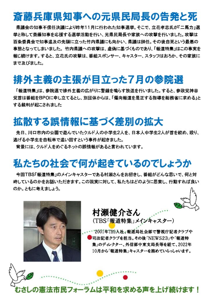 むさしの憲法市民フォーラムは、その参加団体として今回、TBS報道特集のメインキャスター村瀬健介さんのお話を聞く場を企画しました。