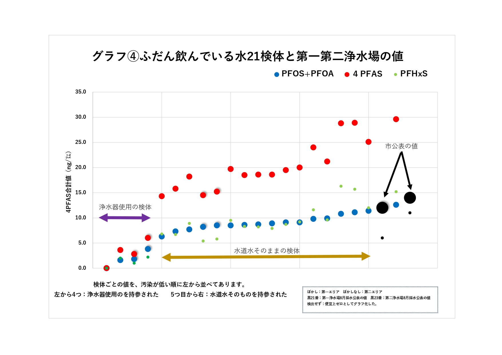 グラフは、4PFAS合計値を低い順に並べている。グラフでわかるように「浄水器使用」4検体はすべて、使用なしより低かった。「検出せず」もあった。