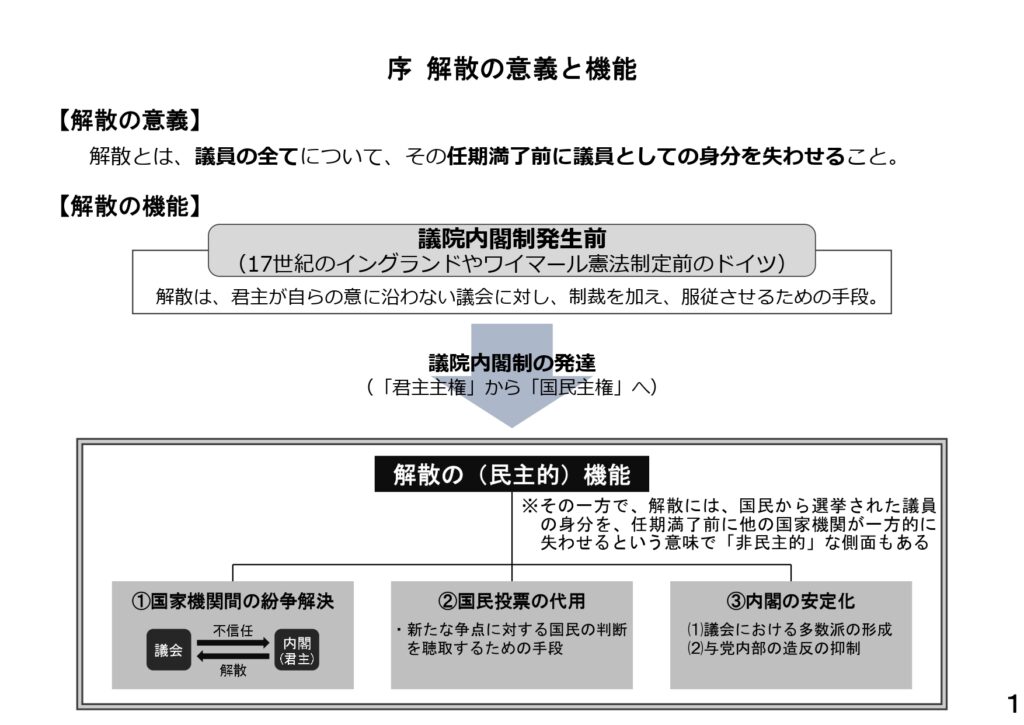 議院内閣制のもととなる考え方を、昨年5月衆議院法制局が資料にまとめている。その冒頭「序」。「17世紀以前のイングランドやワイマール憲法制定前のドイツでは、『解散は、君主が自らの意に沿わない議会に対し、制裁を加え、服従させるための手段。』であった」と明確に書いている。その反省から議院内閣制が発達してきた、と。
