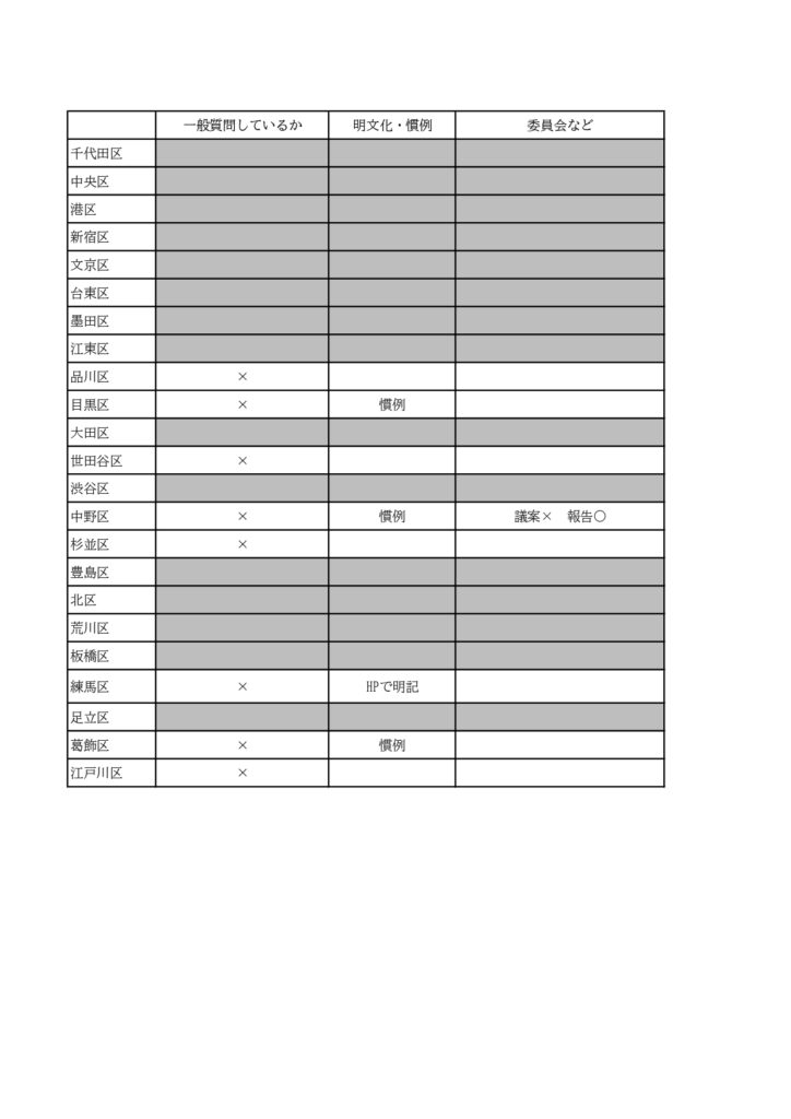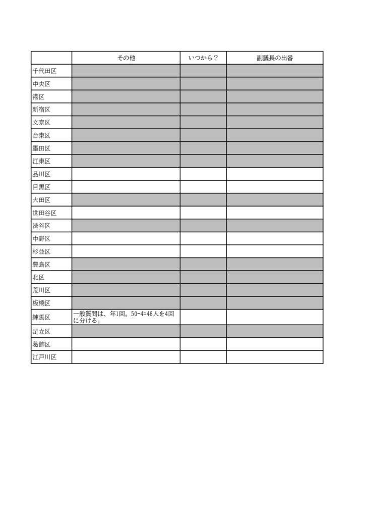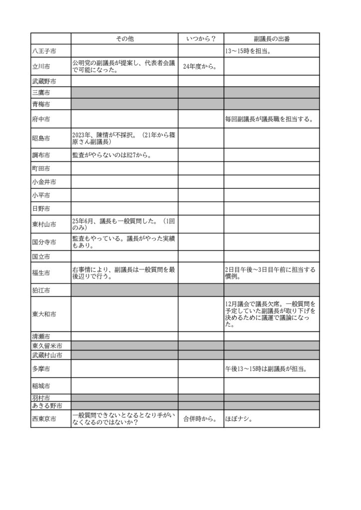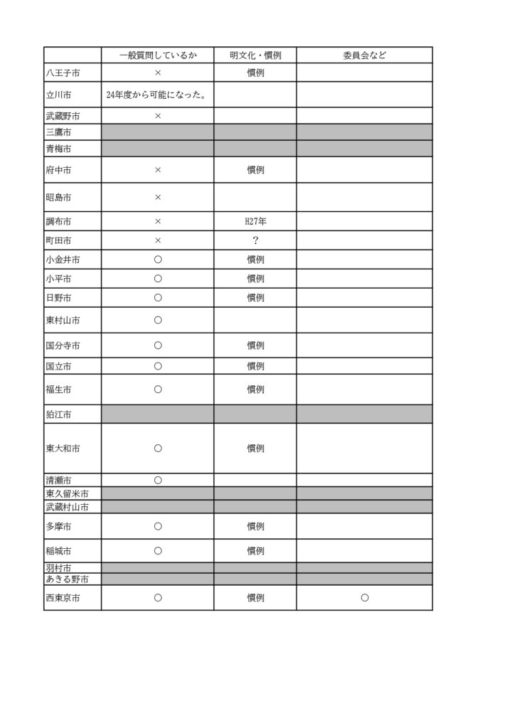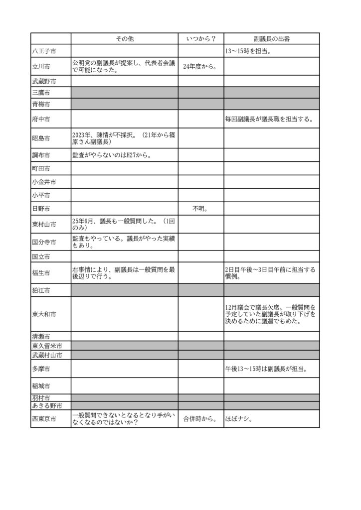 生活者ネットの議員がいる、都内27自治体議会で、「副議長が一般質問しているか」をヒアリングし、表にまとめました。その結果、多摩12市の市議会で、当たり前のように(明文化しているわけでなく、いつ頃からやっているか調べないとわからない状態)一般質問を行っている実態がわかりました。(網掛になっているのは、生活者ネット議員がいない自治体です)